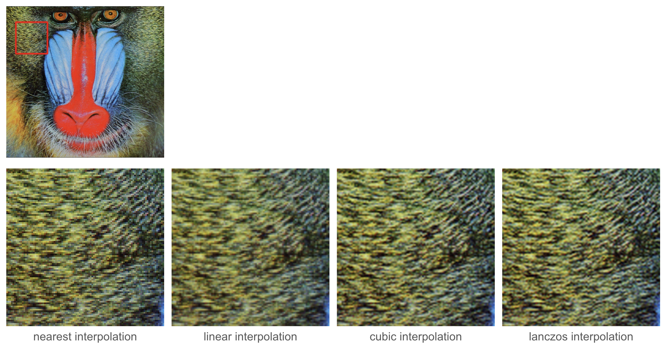 If speed is important during enlargement, nearest or linear can be used, but aliasing may occur or high-frequency components (e.g. image detail or clarity) may be damaged, as can be seen in the enlarged image above. On the other hand, cubic or lanczos can be used to sacrifice speed and improve quality, but this requires improved execution speed.