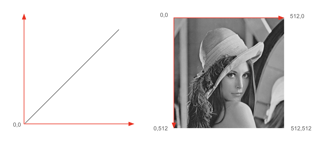 When dealing with images in OpenCV, it is very important to understand the coordinate system. OpenCV represents an image as a two-dimensional matrix, and each pixel is treated as an element of the matrix. In this case, the coordinates represent the pixel locations in the image, and there is a slight difference from the coordinate system used in mathematics. When drawing graphs in mathematics, the positive direction of the x-axis generally points to the east, and the positive direction of the y-axis points to the north. However, in OpenCV, the positive x-axis points to the east, while the positive y-axis points to the south. If the image is 512x512 in size, the origin will be at the top left, and the maximum width and height will be at the bottom right.